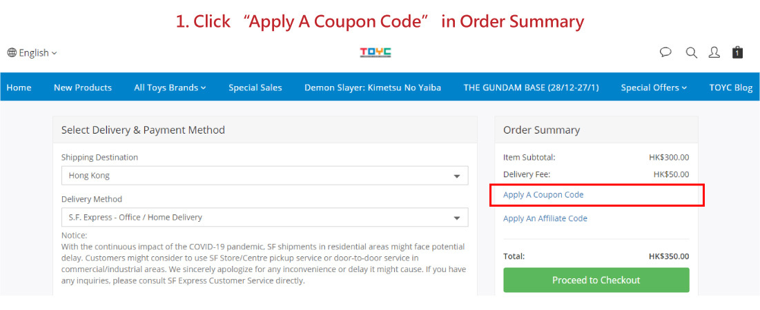 4. Coupon Code is redeemable in electronic transaction by entering the coupon code at the field of “Apply A Coupon Code” during the checkout process of online shopping.