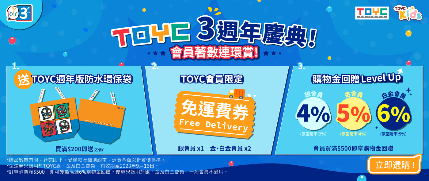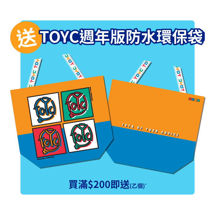TOYC Member will receive a TOYC Limited Edition Tote Bag 2023 upon net purchase over HK$200. Each order will receive one free gift only, free gift while stock lasts.