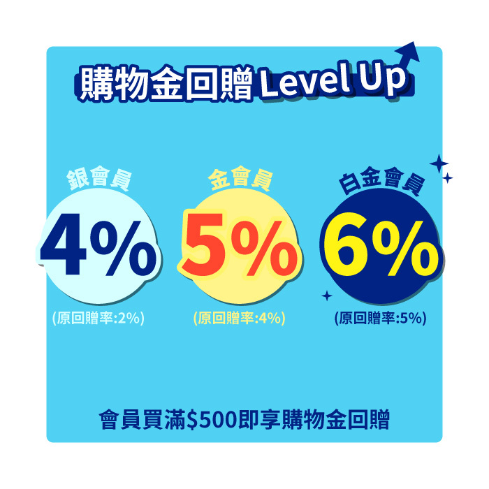 2.) TOYC sliver members can reward up to 4% store credit, gold members can reward up to 5% store credit and platinum members can reward up to 6% store credit, upon purchase of HK$500 or above during the promotion period.