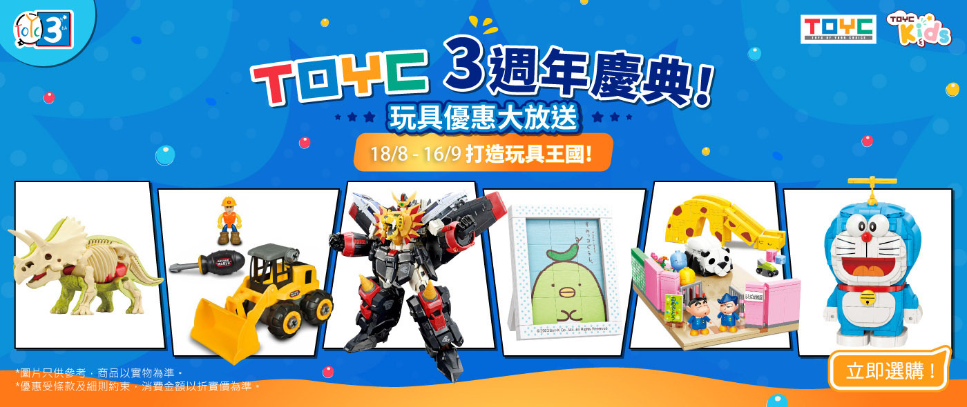 TOYC is now offering toy discounts to celebrate our 3rd Anniversary! 🎉 Explore our various bundle set offers such as HK$120 for 3 pcs or $200 for 2 pcs, and more. Choose your favorite toys and create your own toy kingdom! Free shipping is available for orders over $200(applicable to specified series.) Check out our special offer now!