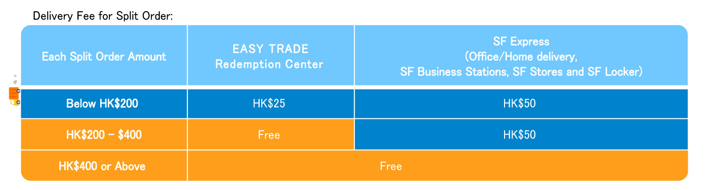 Free local delivery by SF Express upon net purchase of HK$400 or above for each order after split, and free self pick up delivery fee at EASY TRADE Redemption Center upon net purchase of HK$200 or above for each order after split.