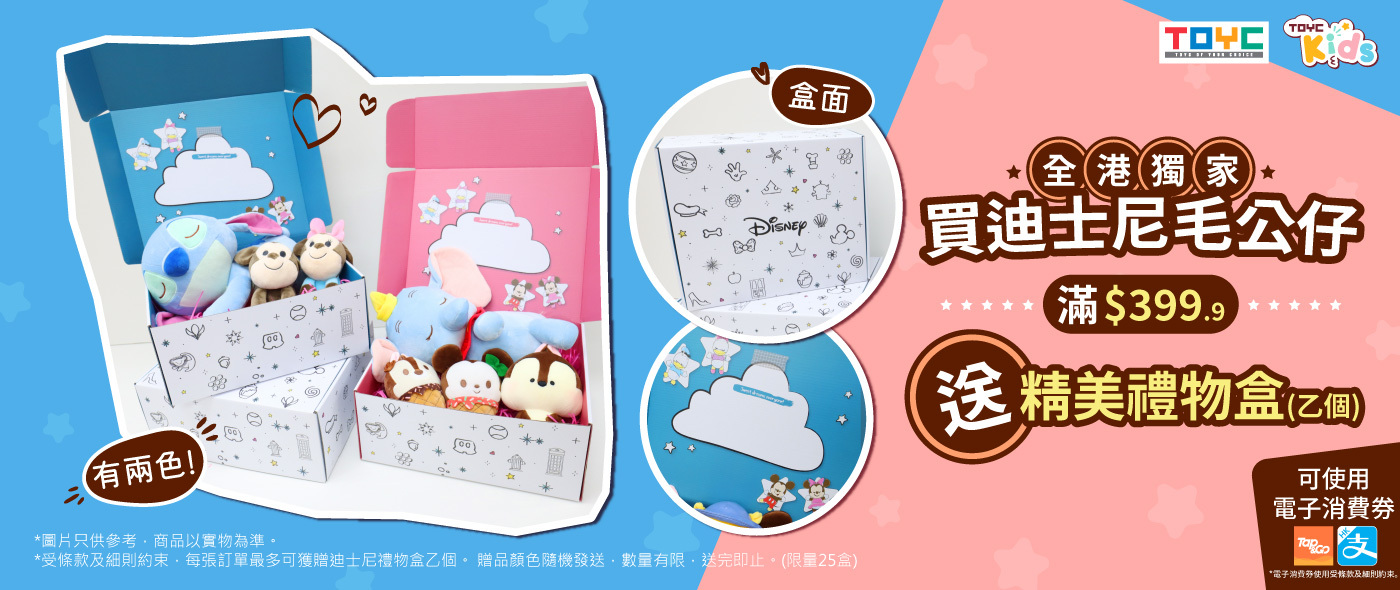4. *凡購買迪士尼毛公仔區之商品滿$399.9,即送迪士尼精美禮物盒乙個,每張訂單最多獲得贈品乙個。
