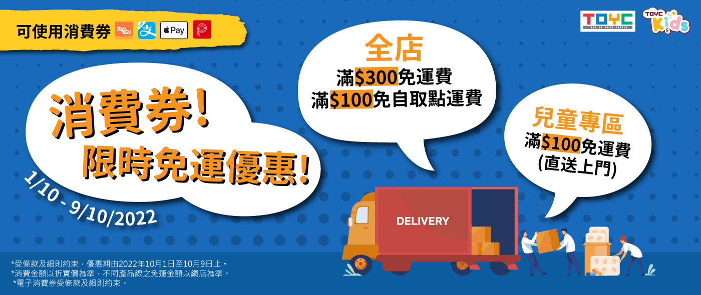 今日派發消費券$3000!全店免運費優惠,由2022年10月1日至9日,凡於TOYC消費滿指定金額即免運費。優惠期間限定,切勿錯過!