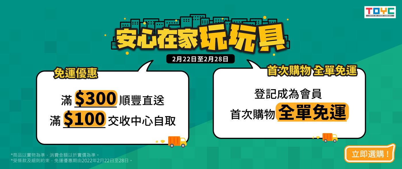 唔洗出街掃一掃,嘟兩嘟。留喺屋企買玩具直送上門!依家「安心回家玩玩具」,TOYC全店消費滿$300免運費,滿$100免自取點運費,所有商品適用。仲唔快D揀心水貨品?