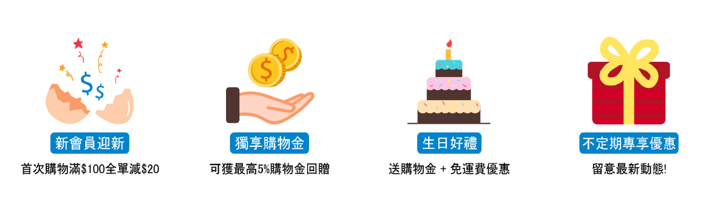 5. TOYC會員獎賞計劃 (新會員迎新獎賞、生日好禮、購物金回贈、會員專享優惠等),必須註冊成為一般會員才能後續升級及領取會員優惠。
