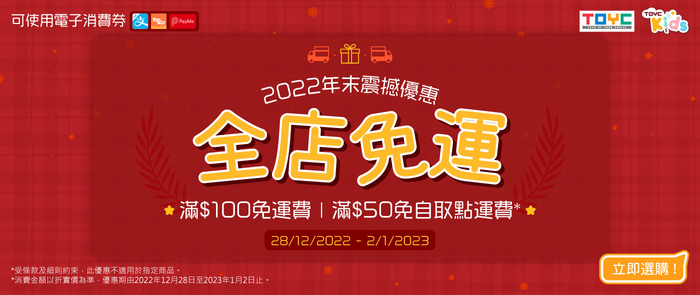 告別2022年! 趁年尾嚟個「年末免運快閃」,全店消費滿$100免運費,滿$50免自取點運費。仲唔快D揀心水貨品? BANDAI模型、Tamashii Nations景品、Hello Kitty、麵包超人等玩具,現貨發售。