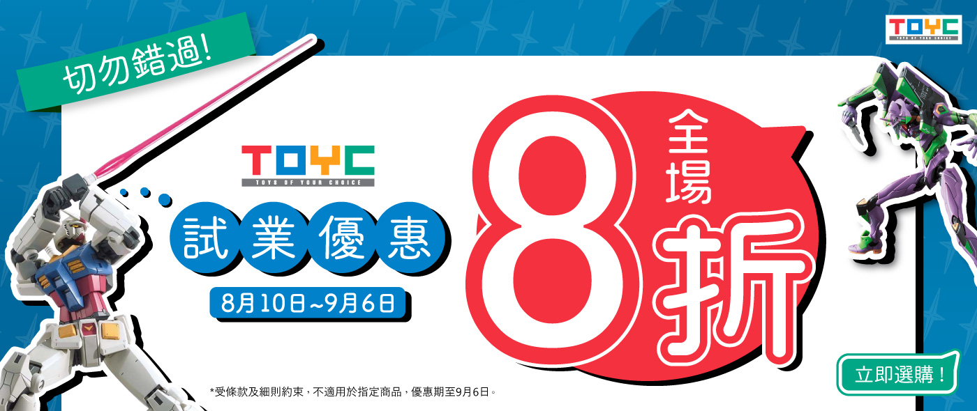 All model kit products (excluding selected items^^) is now 20%^ off from Aug 10th to Sep 6th during soft opening. TOYC will launch new products continually, don’t miss the promotion period!