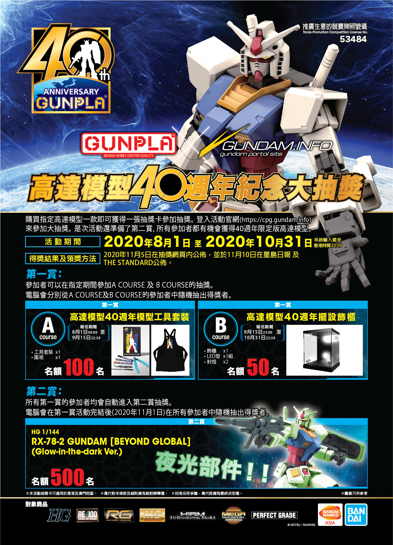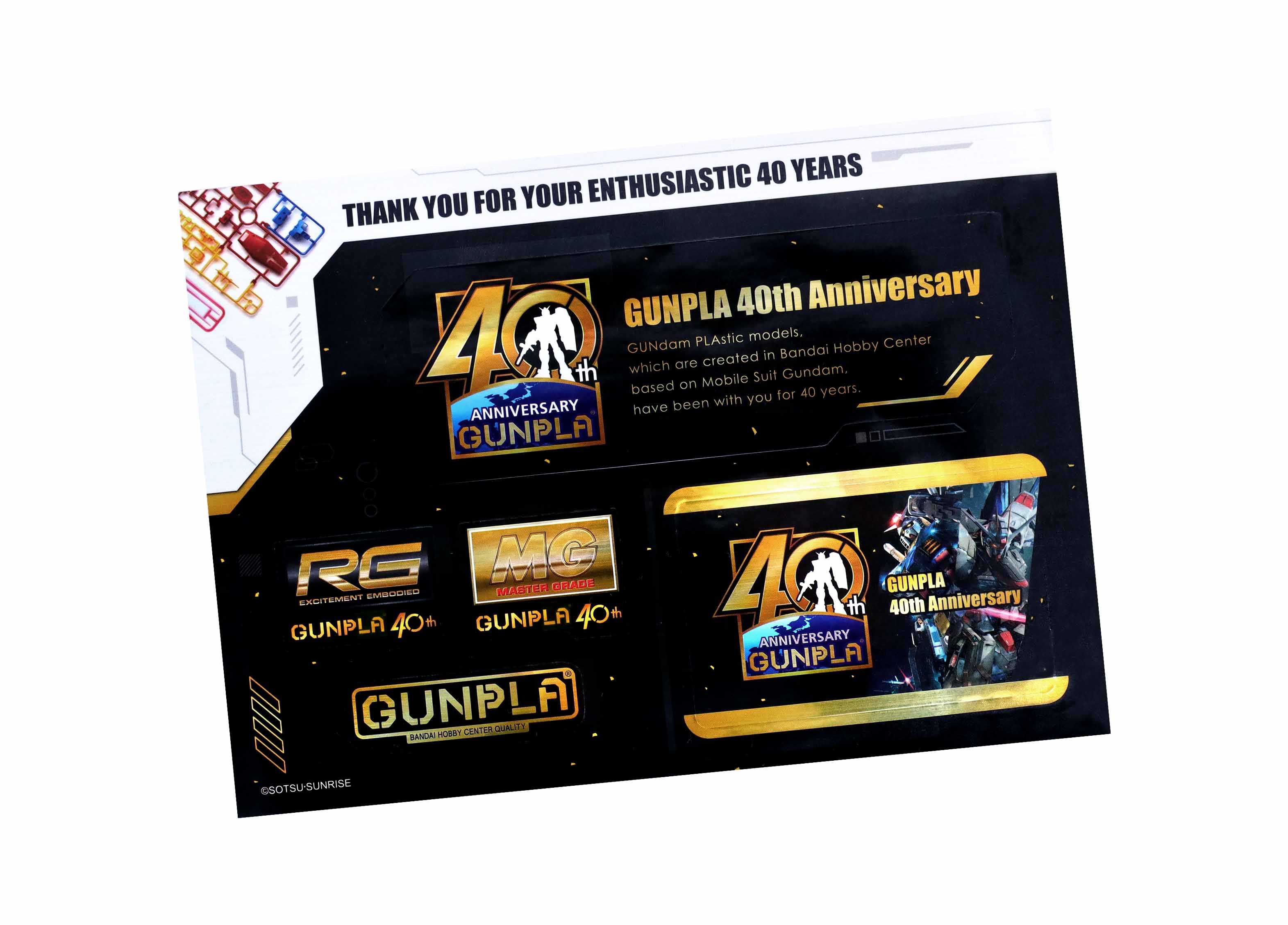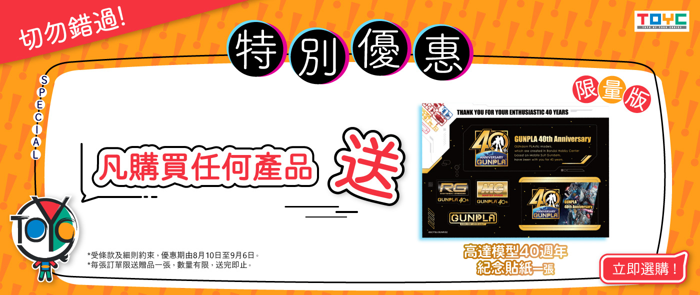 BANDAI designs a limited edition sticker for celebrating Gunpla 40th Anniversary and to thanks all the supporters’ enthusiasm during the past years. Now upon purchase any products in TOYC you will received one Gunpla 40th Anniversary sticker as a gift*.