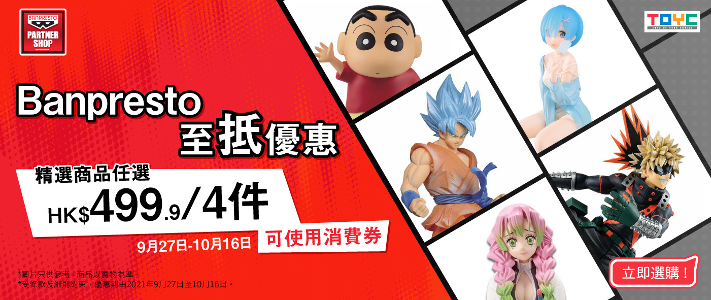 由2021年9月27日至10月16日,Banpresto 指定商品$499.9/4件,景品包括《鬼滅之刃》、《哈利波特》、《美少女戰士》等等! 消費滿$200即免運費。