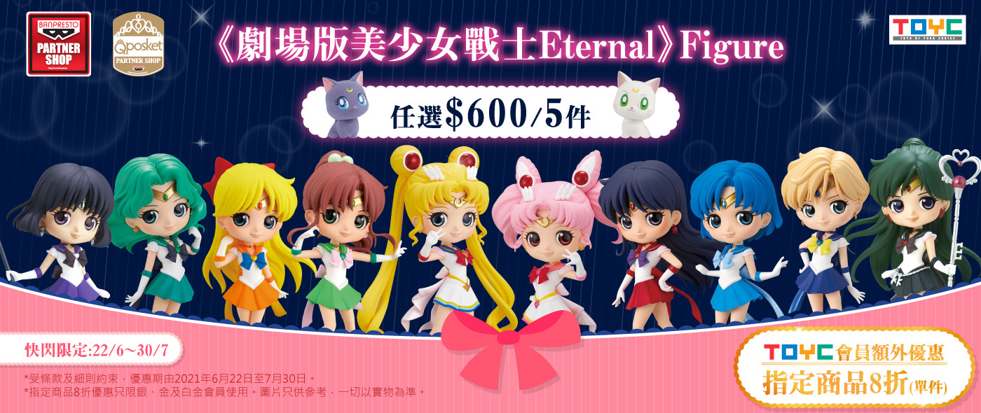由2021年6月22日至7月30日,美少女戰士指定商品$600/5件,仲係《劇場版美少女戰士Eternal》造型! TOYC會員可享額外優惠,指定商品一件8折!(會員需登入後先見到會員價)