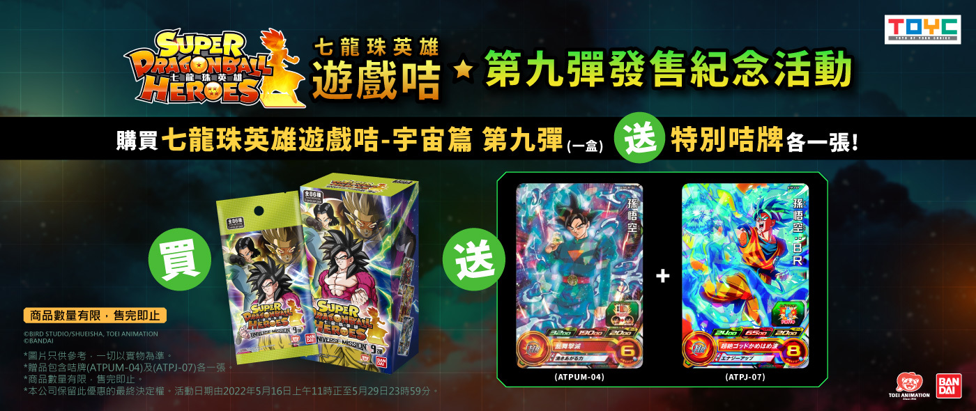 3. *凡購物七龍珠英雄遊戲咭-宇宙篇 第九彈 (20包) 一盒,即可獲贈特別咭牌 (ATPUM-04 及ATPJ-07) 各一張,贈品數量有限,送完即止。圖片只供參考, 一切以實物為準。