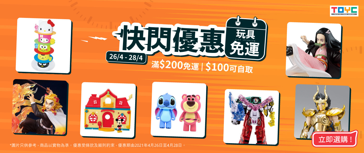 限時3日快閃!即日起至4月28日買滿$200免運費,滿$100免旺角自取點運費!全店商品都適用架!如果揀中指定優惠商品,等於玩具折上折。咁抵!千其唔好錯過機會呀~