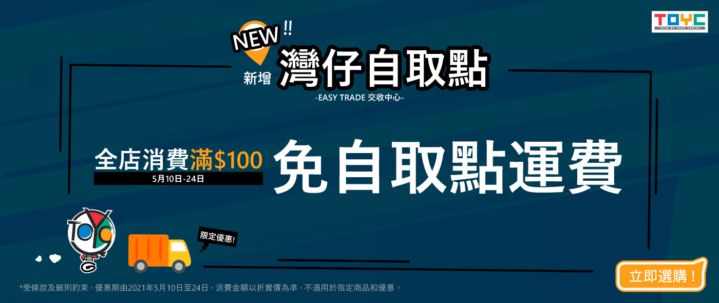 我哋新增灣仔自取點,拎貨更方便‼️ 由2021年5月10日至24日,凡於TOYC消費滿$100即免自取點運費。優惠期間限定,切勿錯過!