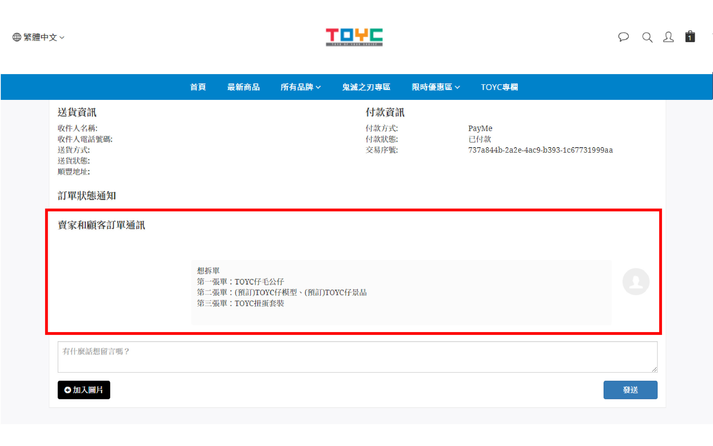 👉例子:假如您的訂單中有以下四款商品,TOYC仔毛公仔、(預訂)TOYC仔模型、(預訂)TOYC仔景品、TOYC扭蛋套裝。