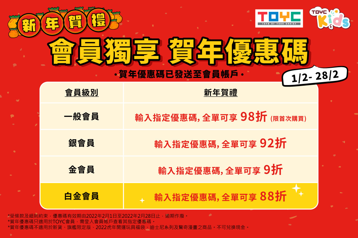 ※賀年優惠碼只適用於TOYC會員,每位會員只可使用一次。